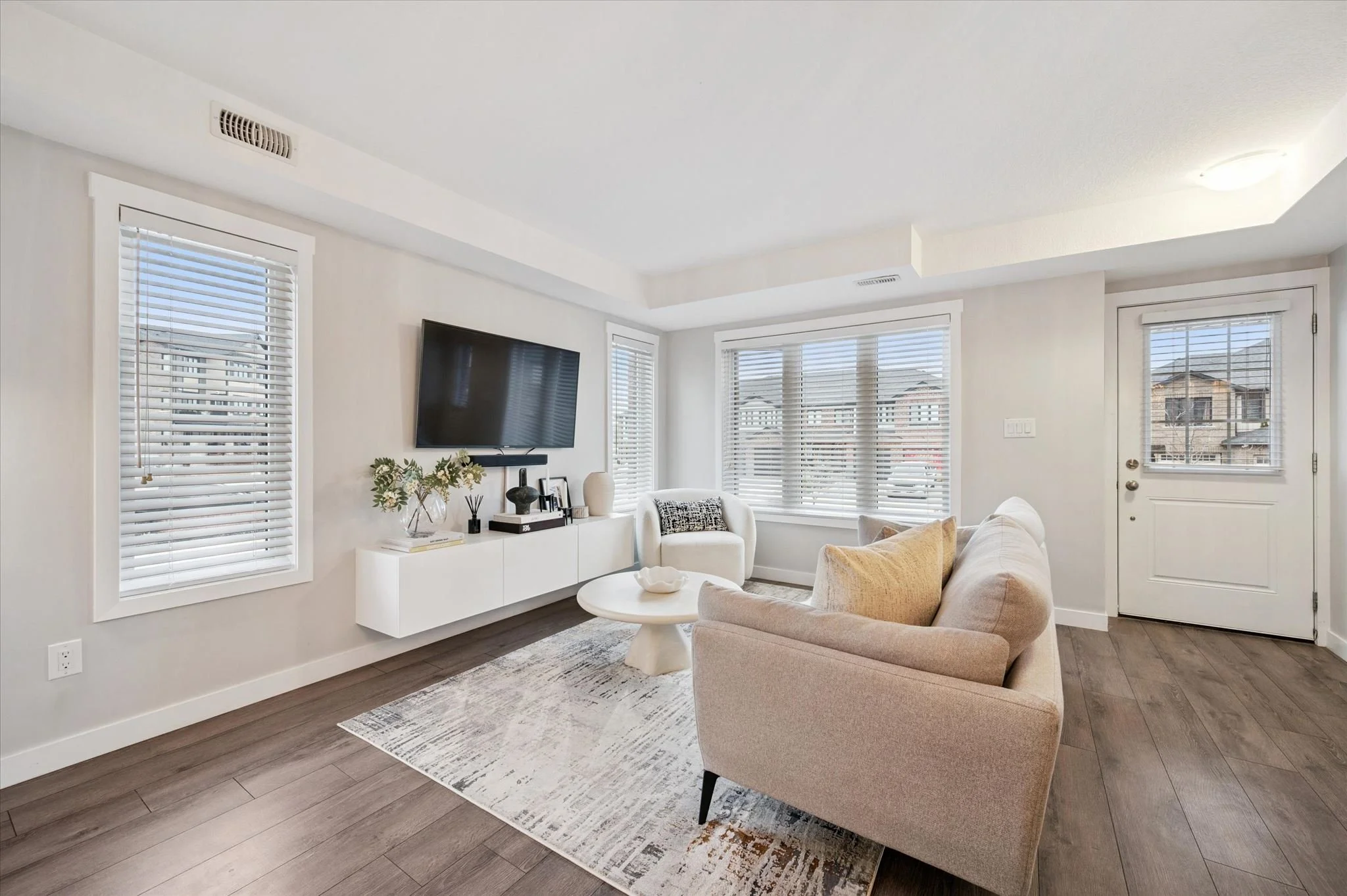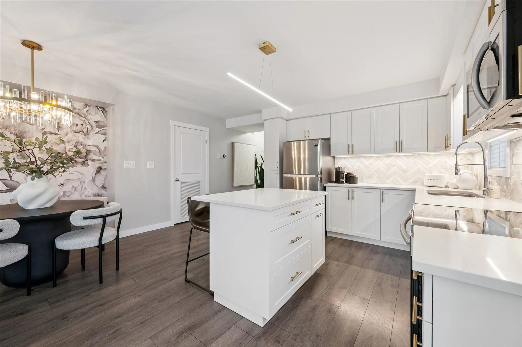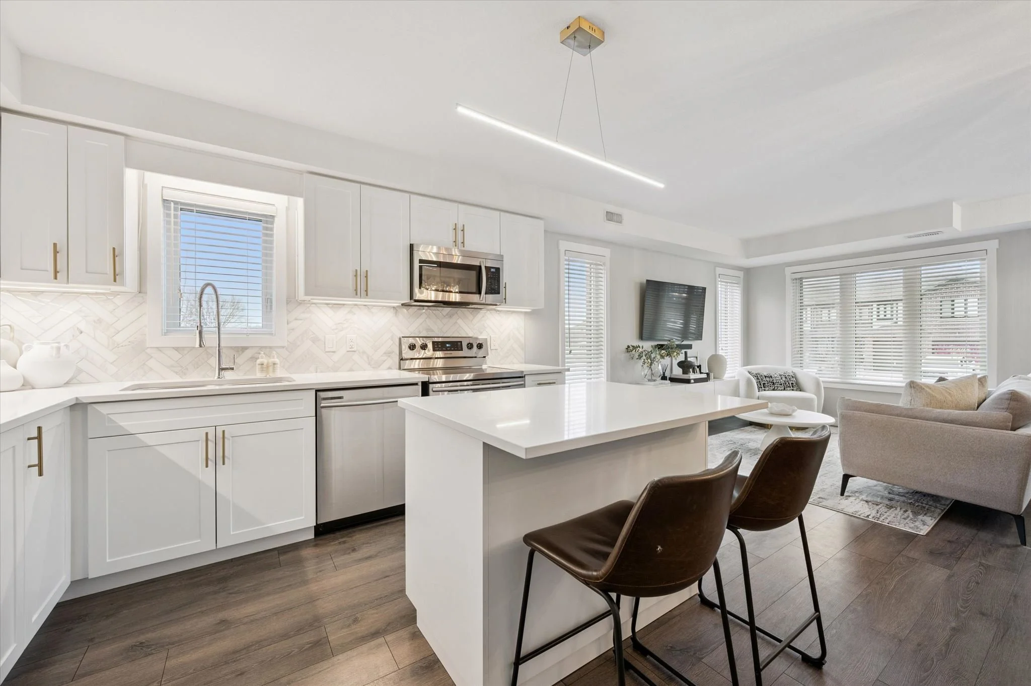 Welcome to this beautifully upgraded 2-bedroom, 2-bathroom corner unit townhouse in the highly sought after Huron Heights community. This single-level home offers a rare blend of designer finishes, functional layout, and everyday convenience. Thoughtfully curated by MC Design Styles, the interior showcases a cohesive, elevated aesthetic throughout. The kitchen features a timeless herringbone Carrera marble backsplash, custom under-cabinet lighting, upgraded fixtures, and brass hardware. The open-concept living space is anchored by a custom built-in media unit and textured accent wall, while Lutron dimmers and a fully integrated Nest system provide seamless smart home living. Enjoy upgraded designer lighting throughout, including a statement LED island feature and modern dining chandelier, complemented by premium custom window treatments that add both privacy and a polished, high-end finish. The spacious primary bedroom offers a spa-inspired ensuite, while the second bedroom and full bath provide flexibility for guests or a home office. As a bright corner unit, the home is filled with natural light and designed for comfortable living. Ideally located close to highway access, Longo’s, RBJ Schlegel Park, walking trails, schools, and more. A standout lease opportunity in a vibrant, family-friendly neighbourhood.